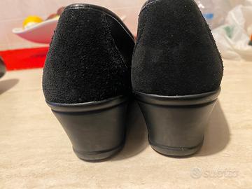 VENDO scarpe MOCASSINO DONNA NERE di camoscio e davanti maculate con pennacchi. Suola antiscivolo numero 36 tacco pari 5 cm.