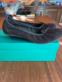 Vendo eleganti décolleté in camoscio color testa di moro, con raffinato fiocco frontale.