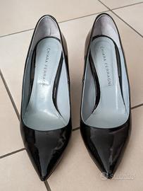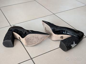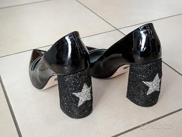Scarpe in vernice nere con tacco largo da 9cm. Il tacco è glitterato con una stella sul retro.