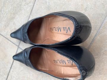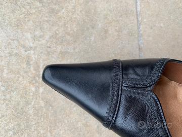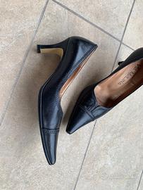 Scarpe “décolleté” nere in pelle. Siccome sono state risuolate, non si vede più il numero ma è un 35. I tacchi sono perfetti. L’unico piccolo difetto è sulla punta di una scarpa ma bisogna proprio saperlo per vederlo.