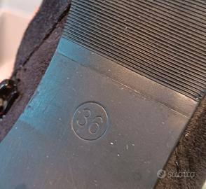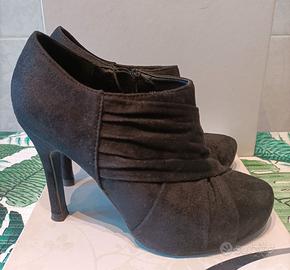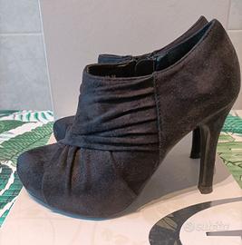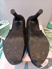 Scarpe nere scamosciate, con tacco a spillo e plateau. Abbastanza accollate e con zip laterale. Usate poche volte, come si può vedere dalle condizioni del tacco e della suola. Spedisco nella loro scatola originale. Disponibili tacchetti di ricambio.