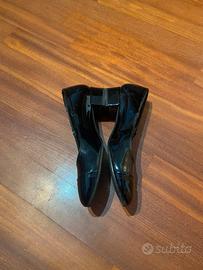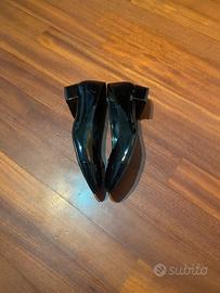 • Design: Modello classico a punta leggermente arrotondata con un dettaglio in vernice lucida sul puntale e sul corpo della scarpa, come visibile in foto. Il colore è un nero profondo e versatile.