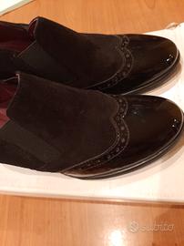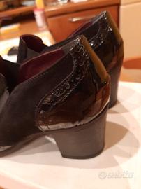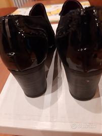 Scarpe nere, ottime per le giornate piovose, punta e tallone in vernice, il resto in camoscio.