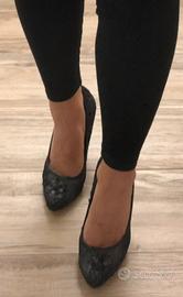 Scarpe nere con paillettes e pizzo Bordo in vernice Tacco comodo Elegantissime Usate poco