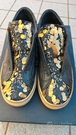 Bellissime sneakers Tosca Blu, modello slip-on, in pelle nera impreziosite da paillettes oro e bronzo. Sono un paio di scarpe eleganti e particolari, perfette per aggiungere un tocco di stile a qualsiasi outfit. - Tomaia in pelle nera - Dettagli in paillettes oro e bronzo - Suola in gomma - Calzata comoda