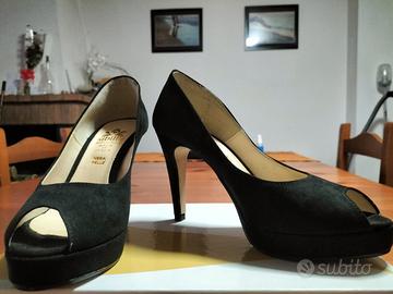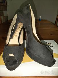 Decolleté finitura camoscio con oblò, tacco h 10 cm comprensivo di plateau h 2 cm.