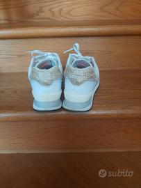 Scarpe usate ma in buona condizione in pelle bianca, con il logo leopardato e i bordi fucsia