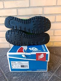 in camoscio verde bosco e N di New Balance in rosso e lacci rossi