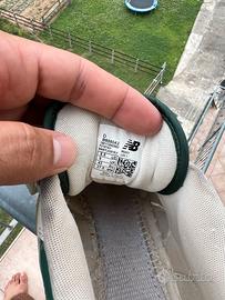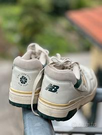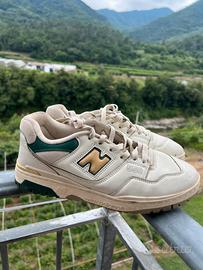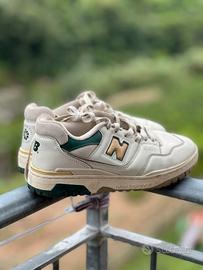 Nell'immagine c'è un paio di sneakers New Balance 550. Le scarpe sono di colore beige chiaro o crema, con dettagli in verde scuro e oro. Il logo "N" dorato con contorno nero è ben visibile sul lato. Sono appoggiate su una ringhiera di metallo, con uno sfondo sfocato di natura verde.