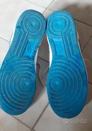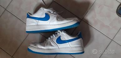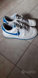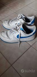 Scarpe Nike Air Force 1 Bianche con logo blu numero 41 Europa. Usate ma in buone condizioni Vendo causa crescita del piede di mio figlio.