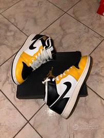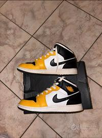 Scarpe Nike Air Jordan 1 Mid in giallo, bianco e nero. Condizioni generali buone con lievi segni di usura.