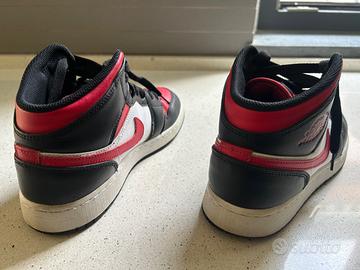 Scarpe da ginnastica modello Nike Air Jordan 1 Mia, taglia 38.5. Colore rosso, nero e bianco in classico stile Chicago con tomaia in pelle liscia inserti neri su punta, lacci e collarino pannelli laterali bianchi con swoosh rosso, punta traforata per una migliore traspirazione Condizioni usate ma buone, con normali segni di utilizzo. Scarpe comode e iconiche. No spedizione.