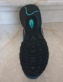 Vendo scarpe da ginnastica numero 45 , NIKE AIR MAX 97 , da uomo , usate , senza scatola , colore antracite( grigio scuro ) con scritte e logo di colore azzurro turchese , usate poco , vedi foto per segni usura.