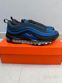 Nike Air Max 97 nel modello Black Royal Blue, caratterizzate da una tomaia in pelle nera e inserti blu. Limited edition Usate una volta