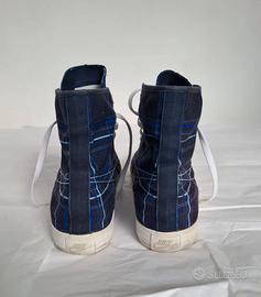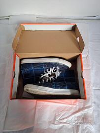 Scarpe a collo alto Nike unisex in colorazione base blu scuro con motivo a righe molto elegante. Simbolo Nike swoosh sui lati. Modello Nike raro. Scarpa a stivaletto stile Converse. Misura 45.