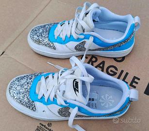 Scarpe Sneaker taglia 37.5 personalizzate "SE" Special Edition, tipico design ma con Glitter Argento & inserti Azure, “UNICHE” perfette per un regalo, non la solita Nike BIANCA.