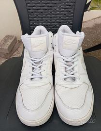 Scarpe Nike, modello: court borough mid bianche, da uomo. Tenute molto bene! Fuoriesce solamente un po' di spugna, ai lati delle linguette. Inoltre, il laccio della scarpa destra è stato sostituito da uno simile a quello originale che c'è ancora nella scarpa sinistra ma non si nota.