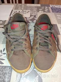 Si tratta di un paio di sneakersNike Court Legacyo un modello molto simile come le Nike Blazer Low, che presentano una tomaia in tela o tessuto spigato (tweed/herringbone) marrone/grigio e uno Swoosh (logo Nike) rosso a contrasto. Hanno una suola in gomma color caramello.