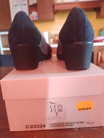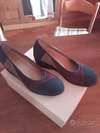 Scarpe da donna nuove, mai usate, vendo per errato acquisto del numero. Sono numero 37. Non posso restituirle perché ho perso lo scontrino. Sono in camoscio colore blu, bordeaux e grigio con fodera e sotto piede in pelle, fondo in gomma con zeppa di 5 cm.