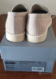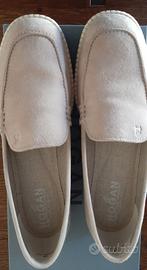 Bellissimi mocassini Hogan a pantofola in pelle scamosciata beige.