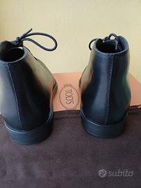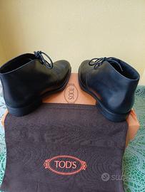 scarpe in pelle modello polacco marca Tod's, colore nero ,suole antiscivolo a pallini, lacci, punte arrotondate, cucitura a vista, solette in cuoio, Numero 6,5 solette interne cm.26, calzata ampia, corrispondente a numero 41.Logo su suole, solette, colletto, sacchetto in dotazione e scatola. Scarpe dalla morbidezza eccellente conferiscono la specificità unica. Consiglio preventiva misurazione analoga scarpa ( in negozio di calzature) per acquisto sicuro e consapevole