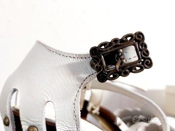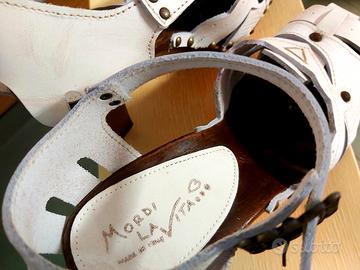 Bellissime e particolari scarpe in pelle bianca e legno, nr. 38, marca "Mordi la Vita"