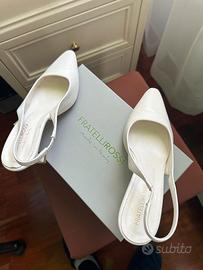 scarpe da sposa modello Chanel, marca Fratelli Rossi, bianco latte, misura 39, tacco 8 a rocchetto, vero cuoio, usate solo per la cerimonia