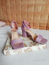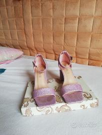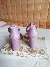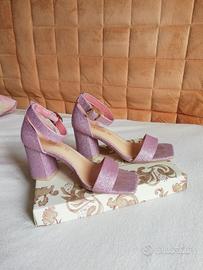 Sandali glitterati sui toni del rosa con cinturino alla caviglia numero 37, tacco quadrato cm 7, con scatola, lunghezza scarpa 24cm, indossati 4/5 volte .