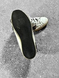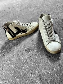 Scarpe in vera pelle bianca con disegni neri realizzate da un artigiano per Patrizia Pepe. Chiusura con lacci e zip laterale. Numero 38 ma calzano perfettamente un 39. In buone condizioni, molto particolari e di qualità.