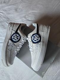 Vendo Nike Air Force 1 personalizzate con logo e scritta Inter fatte a mano, le scarpe sono nuove e ancora inutilizzate, l'unica cosa da non mettere in lavatrice ma usare un pano bagnato per pulire, taglia 43