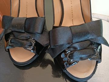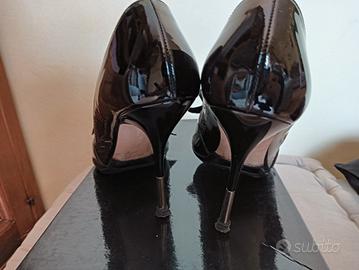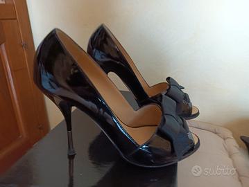 Materiale vernice nera, con fiocco raso. Spuntate davanti, tacco 10 cm con parte finale in metallo. Conservate bene e adattissime per una cerimonia.