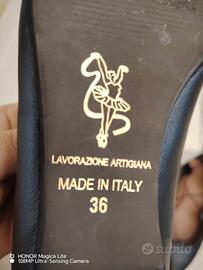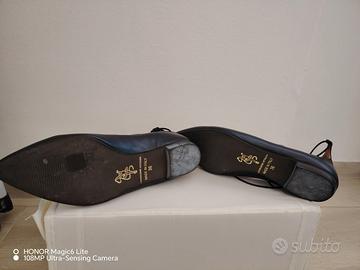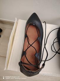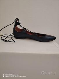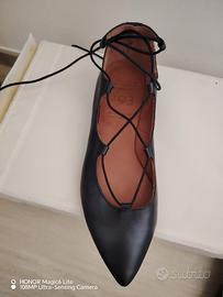 Ballerine a punta in vera pelle neta, marchio 993, con sottili stringhe da incrociare sul piede e allacciare alla caviglia, tacco bassissimo