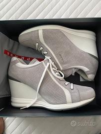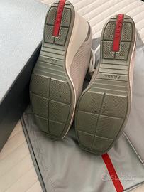 Vendo bellissime scarpe Prada, praticamente nuove , indossate solo per servizio fotografico. Molto belle in nabuk grigio chiaro cin rifiniture bianche . Sportive ed eleganti. Numero 40. Vendo a 150euro compreso scatola e sacchettina.
