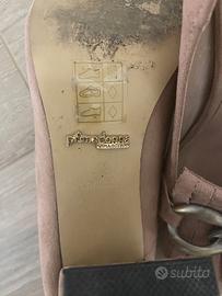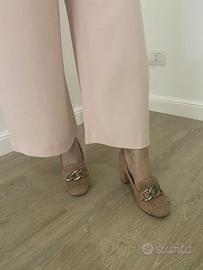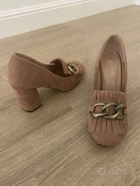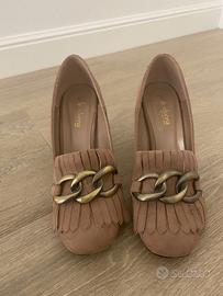 Eleganti scarpe con tacco alto e dettaglio catena. - Materiale scamosciato. - Dettaglio frange. - Tacco largo e stabile. - Taglia 39. Ottime condizioni