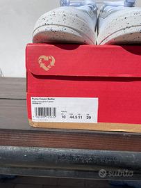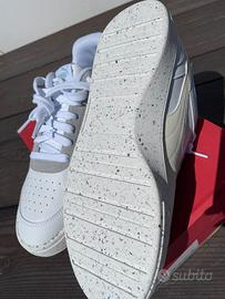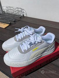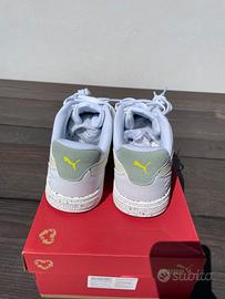 Scarpe da ginnastica Puma nuove, con un design moderno e dettagli unici. - Tomaia in pelle bianca con inserti grigi. - Dettagli color crema e verde sulla tomaia. - Suola con inserti colorati effetto speckled. - Chiusura con lacci bianchi.