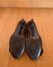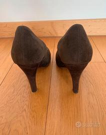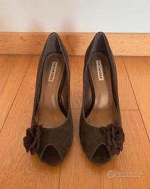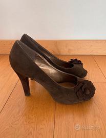 Décolleté aperte davanti, scarpe spuntate ragazza con tacco tronchetto alto circa 10 cm (ma con plateau interno quindi l'altezza sara circa 8 cm), colore marrone scuro scamosciate con fiore a rosa sul fianco. Taglia misura numero 40. Marca gold&gold. Usate solo una volta, come nuove.