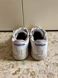 Vendo sneakers Reebok Classic Club C85, colore bianco con scritte blu, in buono stato generale, presentano delle screpolature della pelle in punta (come da ultima foto) ma sono ancora perfettamente utilizzabili. Misura 42,5 EUR.