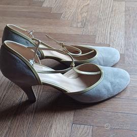 Scarpe eleganti in camoscio grigio chiaro bordate in vernice marca Moda di Fausto. Tacco 9 cm. Misura 43. Base in cuoio e risolate per stabilizzare la camminata. Le vendo perchè non porto più i tacchi.