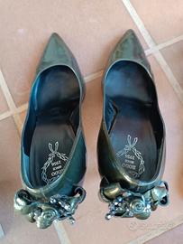 Scarpe con tacco alto a spillo in vera pelle color verde petrolio con splendide applicazioni sul tallone di perline e fiori. Tacco circa 10 cm. Marca RODO