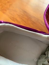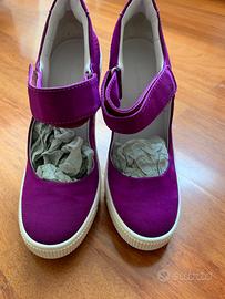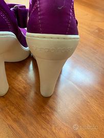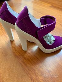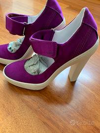 Scarpe in raso colore bouganville n. 36 tacco 9 con plateau, marca Sergio Rossi/Puma. Chiusura in peltro