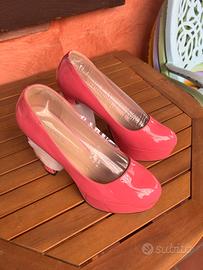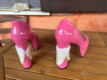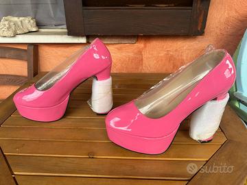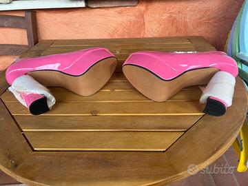 Scarpe da donna rosa acceso della MAIERNISI, taglia 44/45, mai usate come da foto con addirittura ancora il proteggi tacco e il palloncino proteggi forma all'interno delle scarpe. Dalle foto si vede la suola completamente pulita perché mai indossate. Perfette anche per una maschera di carnevale o halloween.