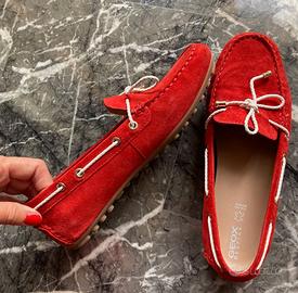 Mocassini da donna della Geox in pelle scamosciata colore rosso con la sua scatola taglia 38,5. Usati una sola volta perciò sono praticamente nuovi.