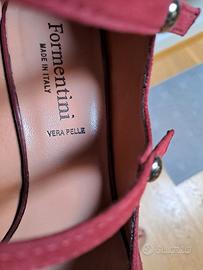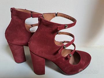 decolette in camoscio rosso scuro con chiusura zip sul retro, tacco alto e largo. molto comode.