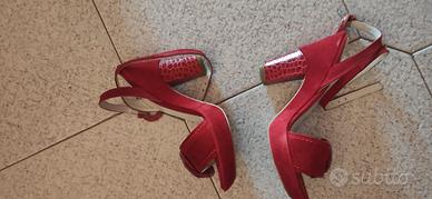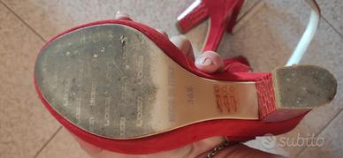 Scarpe meravigliose, rosse con fiore e tacco stampa pitonata e tessuto scamosciato. Perfette per una cerimonia. Indossate una sola volta perché troppo alte per me, tacco cm 11 e plateau cm 2. È possibile vedere in foto il prezzo di acquisto. Interamente prodotto in Italia. Numero 36.5. Ritiro a mano.
