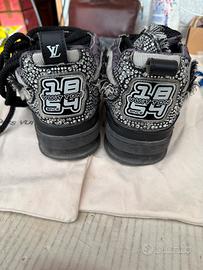 Descrizione: Questa sneaker si ispira ai modelli da skate degli anni Novanta e presenta una tomaia elaborata in rete tecnica e pelle, con un inserto imbottito alla caviglia e doppi lacci. La suola in gomma è decorata con gli iconici fiori Monogram. La versione mostrata nell'immagine è di colore nero, con dettagli che sembrano essere strass o cristalli Swarovski.