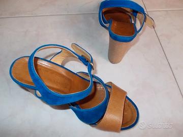 Sandali a fasce marrone /blu elettrico N. 36 tacco doppio cm. 9 allacciatura alla caviglia Vendita a mano su Napoli