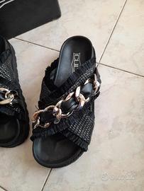 Ciabatta chiusa donna con due corpose fasce incrociate in misto rafia sfrangiata e spessa catena metallica colore argento fumé. Suola 4 cm. Tomaia in tessuto, interno in pelle e suola gomma. Nuovi con la scatola originale: la scatola leggermente rovinata agli angoli.