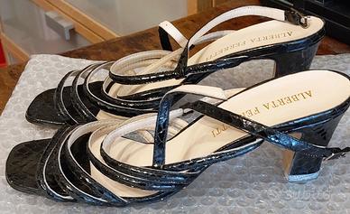 Vendo in condizioni ottime, poco utilizzate, delle scarpe a sandalo per donna di colore nero brillante molto eleganti, della prestigiosa maison Alberta Ferretti. Tacco medio. Taglia riportata sulla suola 38. Si tenga presente, però, che mia madre, proprietaria delle scarpe, normalmente veste, a seconda della scarpa, o un 38 o un 39 e che la lunghezza del piede è di 25,5 cm circa. Quindi si prega di considerare questa circostanza ai fini della taglia. Si spedisce senza scatola originale. Prezzo non trattabile.