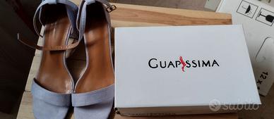 Mix perfetto tra stile contemporaneo e comfort assoluto. Sandali firmati "GUAPPISSIMA" caratterizzati da una raffinata tonalità di viola/lilla ideale per dare all'outfit un tocco di freschezza primaverile ed estivo taglia "38". Pelle morbidissima e scamosciata. È stata progettata per avvolgere il piede in modo piacevole senza il tipico fastidio del sandalo nuovo. Punta squadrata di tendenza e tacco a blocco che garantisce stabilità e comodità per tutto il giorno. Condizioni impeccabili come si vede dalle foto dalla suola e dagli interni. Cinturino alla caviglia regolabile che come la pelle della scarpa si contrasta con il color cuoio all'interno.