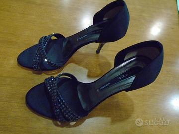 Scarpe sandali decolleté marca originale Albano, numero 36, in raso nero con stringhe intrecciate decorate con perline, chiuse dietro al tallone.